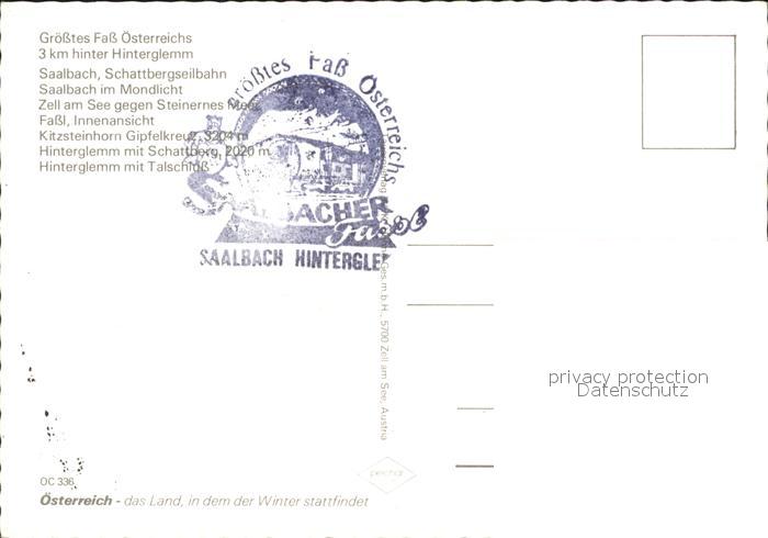 11923574 alte Postkarte Saalbach-Hinterglemm Groesstes Fass oesterreichs Seilbahn Zell am See Kitzsteinhorn Gipfelkreuz Schattberg postalisch gelaufen Erhaltung siehe scans KatCode: 11390322050618