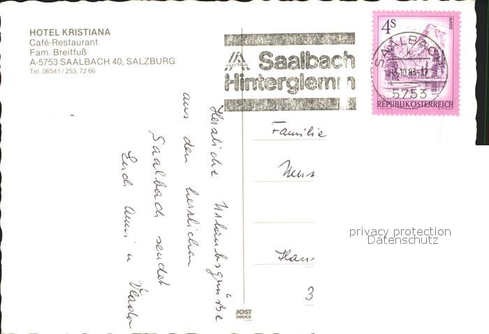 71822295 alte Postkarte Saalbach-Hinterglemm Hotel Kristiana postalisch gelaufen Erhaltung siehe scans KatCode: 11390322050618