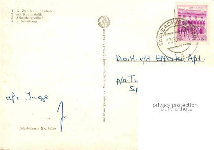72893516 alte Postkarte Saalbach-Hinterglemm Kohlmaislift Schattbergseilbahn Penhab postalisch gelaufen Erhaltung siehe scans [LiesaD40] KatCode: 11390322050618