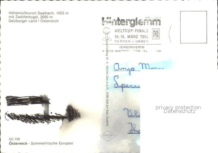 72092278 alte Postkarte Saalbach-Hinterglemm mit Kirche und Zwoelferkogel postalisch gelaufen Erhaltung siehe scans KatCode: 11390322050618