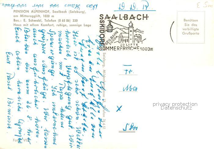 13185090 alte Postkarte Saalbach-Hinterglemm Pension Alpenhof postalisch gelaufen Erhaltung siehe scans [NatalD47] KatCode: 11390322050618