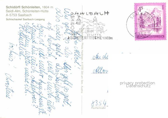 72651884 alte Postkarte Saalbach-Hinterglemm Schoenleitenhuette Seidl Alm postalisch gelaufen Erhaltung siehe scans [WerneD78] KatCode: 11390322050618