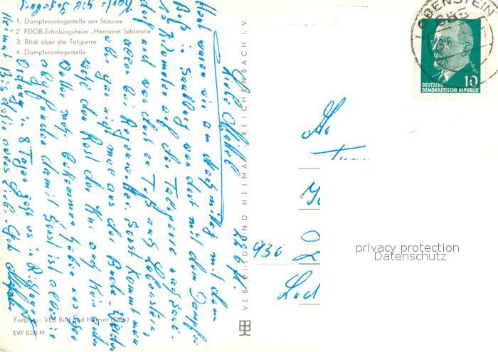 73633504 alte Postkarte Saalburg Saale Dampferanlegestelle am Stausee FDGB Erholungsheim Hermann Schlimme Talsperre Anlegestelle postalisch gelaufen Erhaltung siehe scans [WerneD78] KatCode: 11110016075135