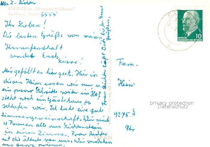 73098476 alte Postkarte Saalburg Saale FDGB Heim Hermann Schlimme postalisch gelaufen Erhaltung siehe scans [KathaD81] KatCode: 11110016075135