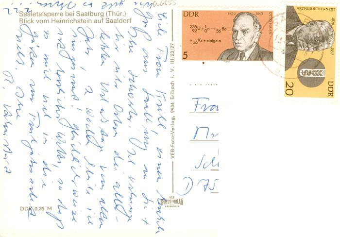 73938611 alte Postkarte Saalburg Saale Thueringen Saaletalsperre Blick vom Heinrichstein auf Saaldorf postalisch gelaufen Erhaltung siehe scans [WerneD78] KatCode: 11110016075135