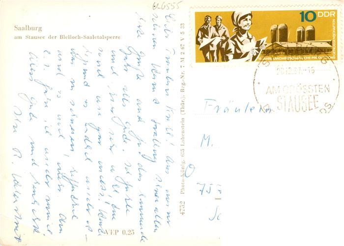 73938613 alte Postkarte Saalburg Saale Thueringen Stausee der Bleiloch Saaletalsperre postalisch gelaufen Erhaltung siehe scans [WerneD78] KatCode: 11110016075135