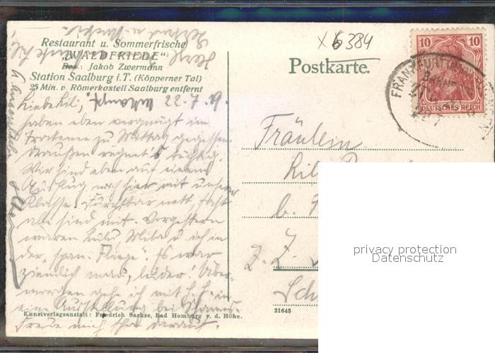 41756837 alte Postkarte Saalburg Taunus Restaurant Sommerfrische Waldfriede Bahnpost postalisch gelaufen Erhaltung siehe scans KatCode: 11110006434012