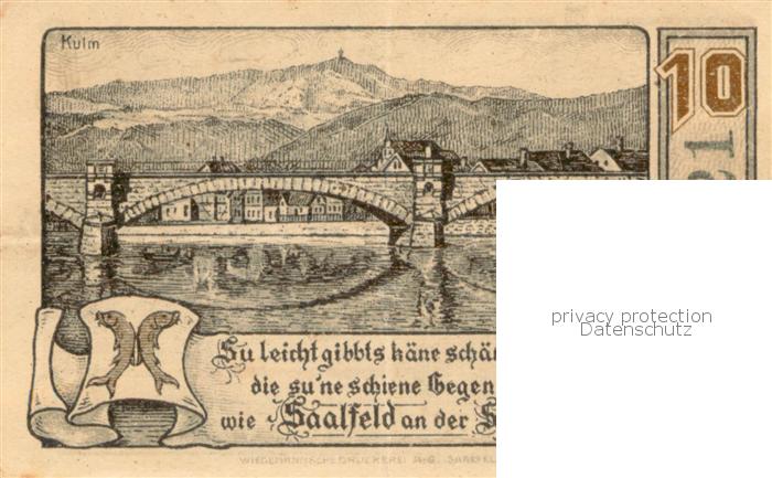 73770087 Saalfeld Saale 10 Pfennig Schein Saaltor Saalebruecke postalisch nicht gelaufen Notgeldschein (keine Postkarte) Erhaltung siehe scans [WerneD78] KatCode: 11110016073077