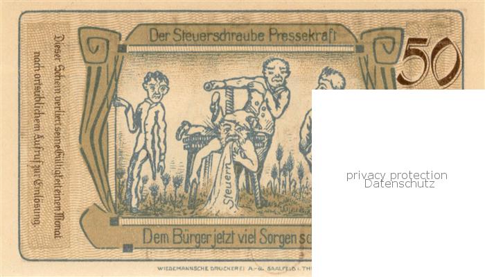 73770091 Saalfeld Saale 50 Pfennig Gutschein Rathaus Steuerschraube Presskraft Karikatur postalisch nicht gelaufen Notgeldschein (keine Postkarte) Erhaltung siehe scans [WerneD78] KatCode: 11110016073077