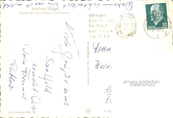 72396743 alte Postkarte Saalfeld Saale Bruecke der Freundschaft Saaltor postalisch gelaufen Erhaltung siehe scans KatCode: 11110016073077