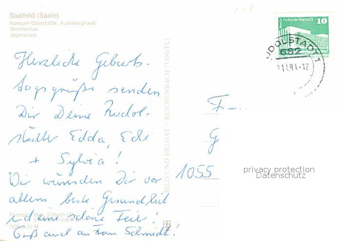 72855211 alte Postkarte Saalfeld Saale Gaststaette Klumberghaus postalisch gelaufen Erhaltung siehe scans [AndreD76] KatCode: 11110016073077