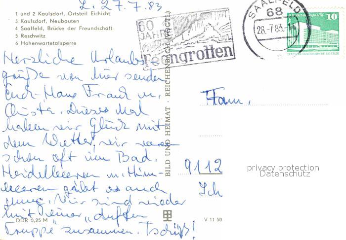 72704482 alte Postkarte Saalfeld Saale Kaulsdorf OT Eichicht Neubauten Bruecke der Freundschaft Reschwitz Hohenwartetalsperre postalisch gelaufen Erhaltung siehe scans [FriedD77] KatCode: 11110016073077