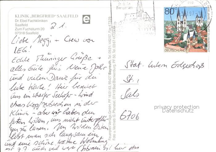 72320026 alte Postkarte Saalfeld Saale Klinik Bergfried postalisch gelaufen Erhaltung siehe scans KatCode: 11110016073077