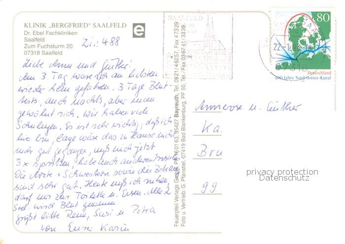 73775355 alte Postkarte Saalfeld Saale Klinik Bergfried Saalfeld Fliegeraufnahme postalisch gelaufen Erhaltung siehe scans [WerneD78] KatCode: 11110016073077