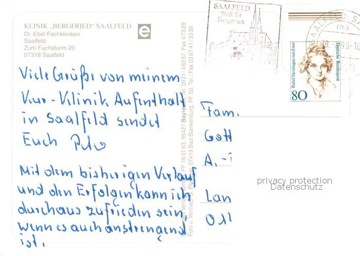 73776613 alte Postkarte Saalfeld Saale Klinik Bergfried Saalfeld Teilansichten postalisch gelaufen Erhaltung siehe scans [LiesaD40] KatCode: 11110016073077