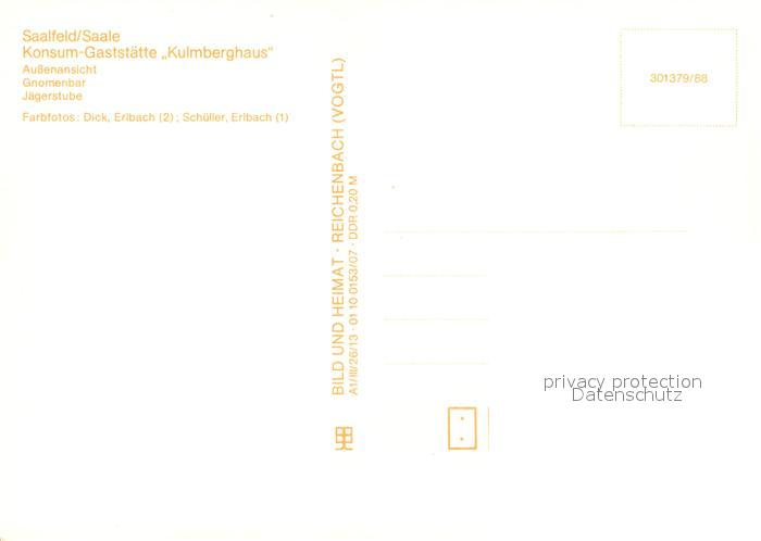 73106456 Saalfeld Saale Konsum Gaststaette Kulmberghaus Gnomenbar Jaegerstube postalisch nicht gelaufen Erhaltung siehe scans [KathaD81] KatCode: 11110016073077