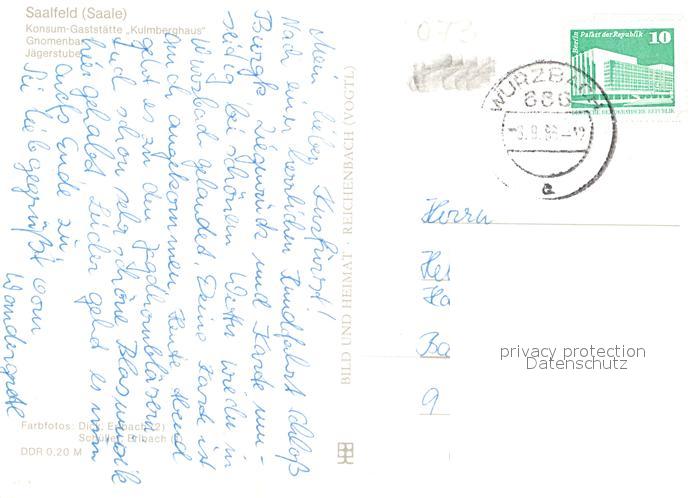 72943854 alte Postkarte Saalfeld Saale Konsumgaststaette Kulmberghaus postalisch gelaufen Erhaltung siehe scans [KathaD81] KatCode: 11110016073077