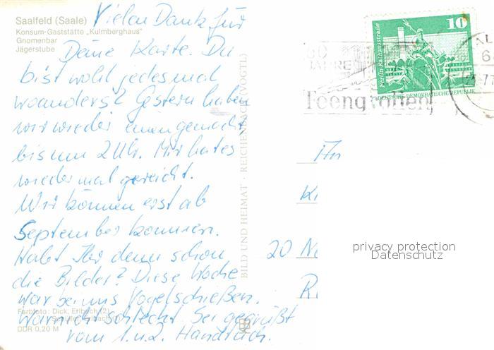72701305 alte Postkarte Saalfeld Saale Konsumgaststaette Kulmberghaus postalisch gelaufen Erhaltung siehe scans [KathaD79] KatCode: 11110016073077