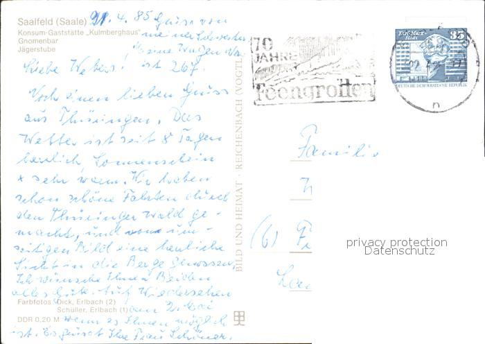 72524723 alte Postkarte Saalfeld Saale Konsumgaststaette Kulmberghaus postalisch gelaufen Erhaltung siehe scans KatCode: 11110016073077
