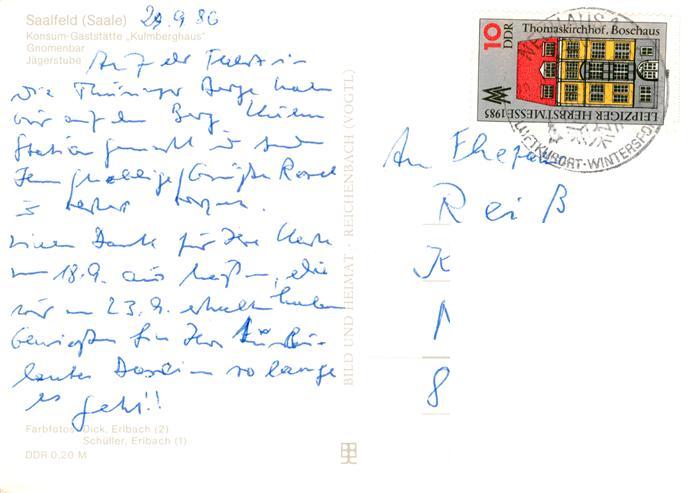 73880702 alte Postkarte Saalfeld Saale Konsumgaststaette Kulmberghaus Gnomenbar Jaegerstube postalisch gelaufen Erhaltung siehe scans [FriedD77] KatCode: 11110016073077