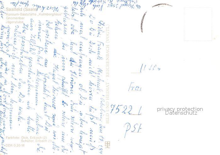 73016353 alte Postkarte Saalfeld Saale Konsumgaststaette Kulmberghaus postalisch gelaufen Erhaltung siehe scans [NatalD47] KatCode: 11110016073077