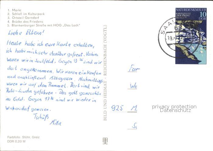 72323080 alte Postkarte Saalfeld Saale Markt Schloss im Kulturpark Gorndorf Bruecke des Friedens Blankenburger Strasse postalisch gelaufen Erhaltung siehe scans KatCode: 11110016073077