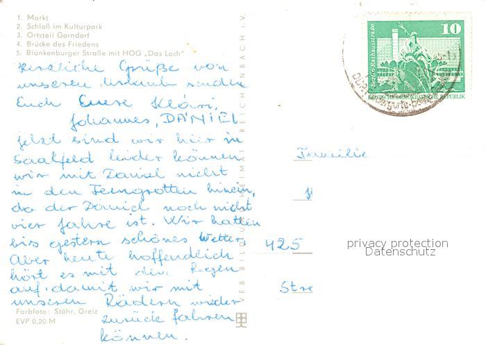 73076933 alte Postkarte Saalfeld Saale Markt Schloss Kulturpark Gorndorf Bruecke des Friedens HOG Das Loch postalisch gelaufen Erhaltung siehe scans [KathaD81] KatCode: 11110016073077