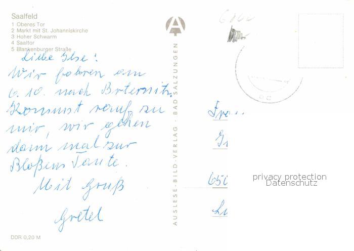 72749747 alte Postkarte Saalfeld Saale Oberes Tor Markt Sankt Johanniskirche Hoher Schwarm Saaltor postalisch gelaufen Erhaltung siehe scans [KathaD81] KatCode: 11110016073077