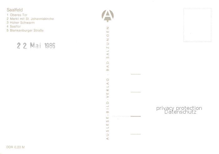 72972849 Saalfeld Saale Oberes Tor Markt St Johanniskirche Hoher Schwarm Saaltor Blankenburger Strasse Wappen postalisch nicht gelaufen Erhaltung siehe scans [FriedD77] KatCode: 11110016073077