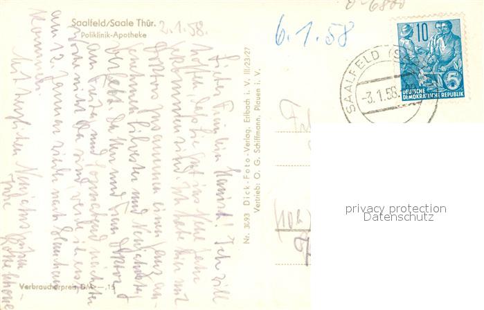 43353104 alte Postkarte Saalfeld Saale Poliklinik Apotheke postalisch gelaufen Erhaltung siehe scans [KathaD81] KatCode: 11110016073077