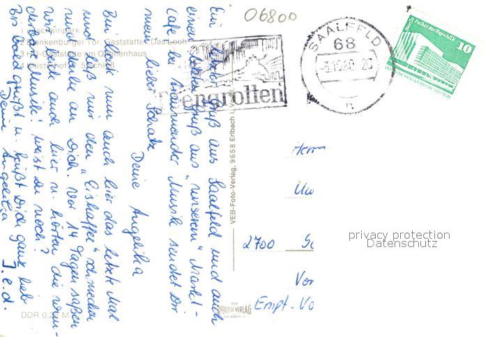 72917358 alte Postkarte Saalfeld Saale Puschkinpark Gaststaette Das Loch Gaststaette am Quellenhaus postalisch gelaufen Erhaltung siehe scans [PaolaD17] KatCode: 11110016073077