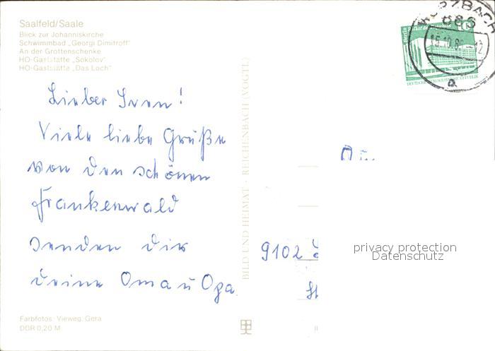 72076706 alte Postkarte Saalfeld Saale Schwimmbad Georgi Dimitroff Grottenschenke Gaststaette Sokolov postalisch gelaufen Erhaltung siehe scans KatCode: 11110016073077