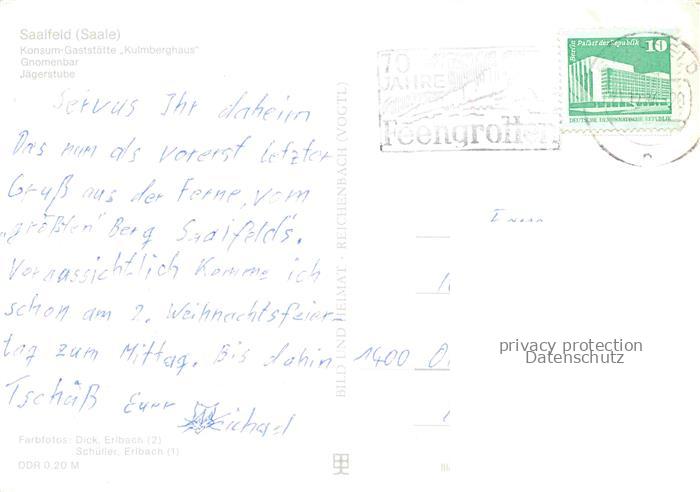 74100713 alte Postkarte Saalfeld Saale Thueringen Konsumgaststaette Kulmberghaus Gnomenbar Jaegerstube postalisch gelaufen Erhaltung siehe scans [FriedD77] KatCode: 11110016073077
