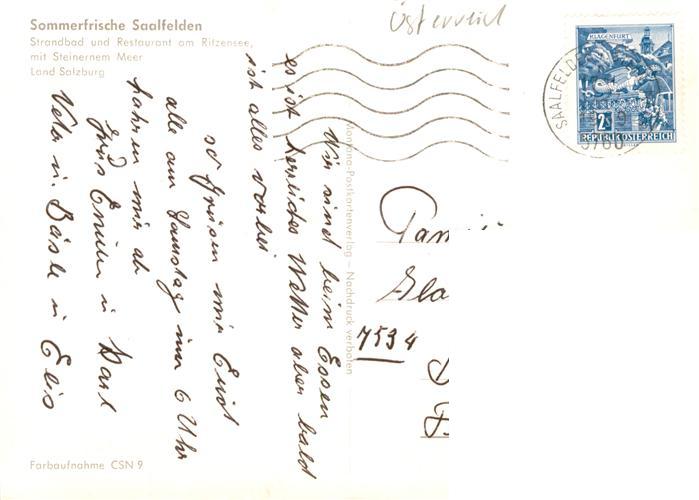 73937082 alte Postkarte Saalfelden Steinernes Meer AT Strandbad und Restaurant am Ritzensee mit Steinernem Meer postalisch gelaufen Erhaltung siehe scans [WerneD78] KatCode: 11390322050619