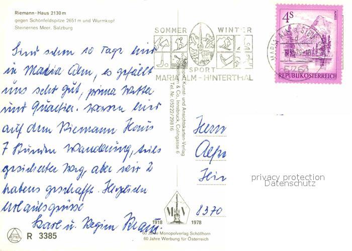 72626740 alte Postkarte Saalfelden Steinernes Meer Riemannhaus Schutzhuette Alpen postalisch gelaufen Erhaltung siehe scans [FriedD77] KatCode: 11390322050619