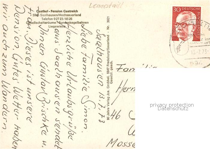 73868200 alte Postkarte Saalhausen Sauerland Gasthof Pension Gastreich Gaststube Garten Fachwerkhaus postalisch gelaufen Erhaltung siehe scans [FriedD77] KatCode: 11110005966020