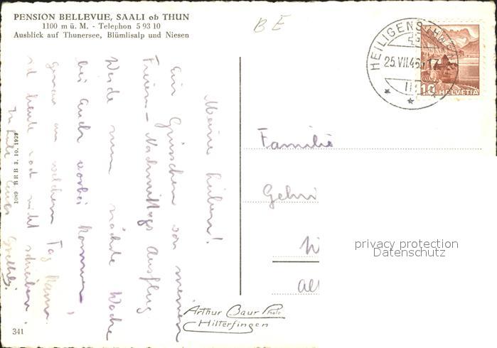 11640024 alte Postkarte Saali Heiligenschwendi Pension Bellevue Thunersee postalisch gelaufen KatCode: 11470060240758