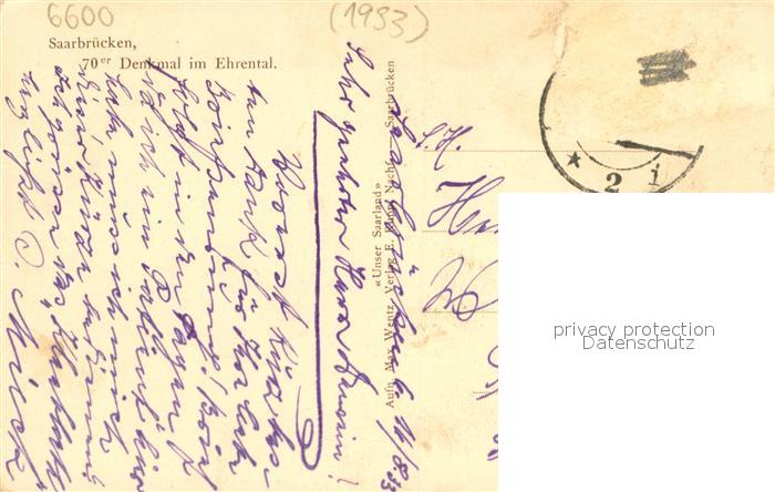 73694658 SAARBRueCKEN Saarland 70er Denkmal im Ehrental postalisch gelaufen Erhaltung siehe scans [FriedD77] alte Postkarte Frie Katcode 11110010041100