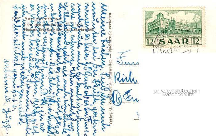 73146705 alte Postkarte SAARBRueCKEN Saarland Aussichtsturm auf dem Schwarzenberg postalisch gelaufen Erhaltung siehe scans [FriedD77] KatCode: 11110010041100