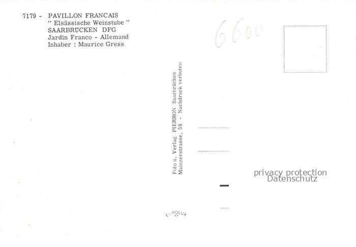 74042634 SAARBRueCKEN Saarland Pavillon Francais Elsaessische Weinstube postalisch nicht gelaufen Erhaltung siehe scans [FriedD77] Frie Katcode 11110010041100