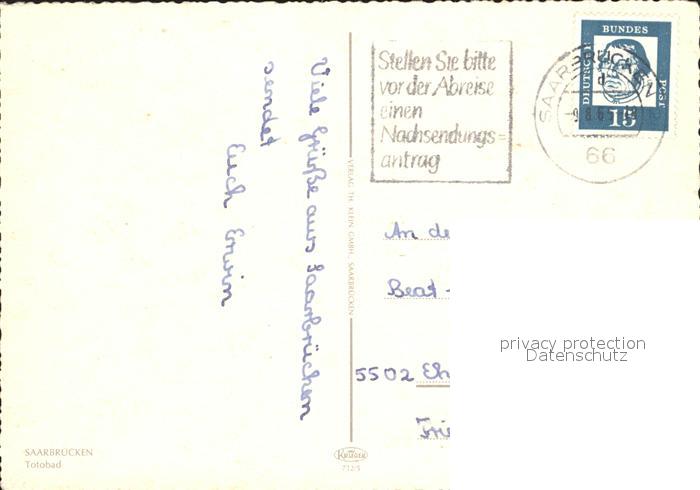 72063139 alte Postkarte SAARBRueCKEN Saarland Totobad postalisch gelaufen Erhaltung siehe scans KatCode: 11110010041100