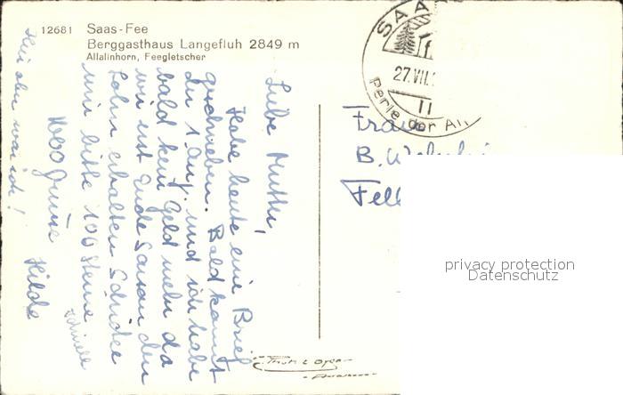 11853304 alte Postkarte Saas-Fee Berggasthaus Langefluh mit Allalinhorn und Feegletscher postalisch gelaufen Erhaltung siehe scans KatCode: 11470230750738