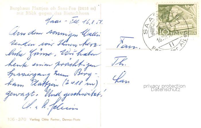 13831107 alte Postkarte Saas-Fee VS Berghaus Plattjen mit Blick gegen das Bietschhorn postalisch gelaufen Erhaltung siehe scans [FriedD77] KatCode: 11470230750738
