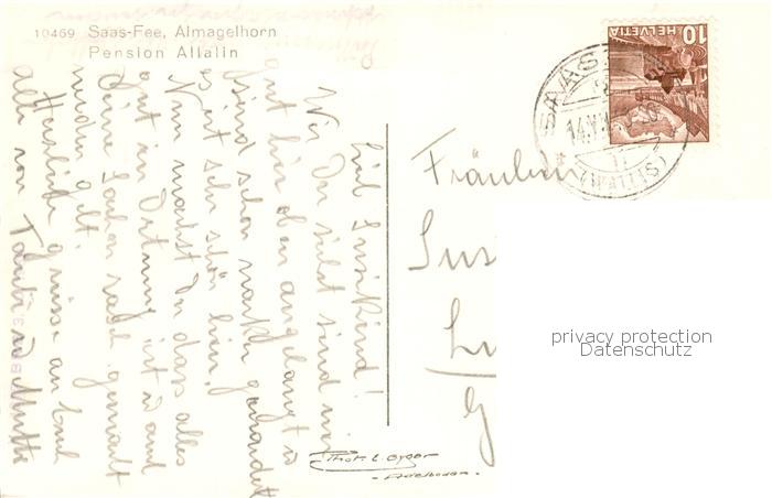 13831127 alte Postkarte Saas-Fee VS Pension Allalin mit Almagelhorn postalisch gelaufen Erhaltung siehe scans [FriedD77] KatCode: 11470230750738