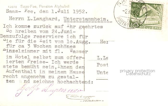 13831215 alte Postkarte Saas-Fee VS Pension Alphubel postalisch gelaufen Erhaltung siehe scans [FriedD77] KatCode: 11470230750738
