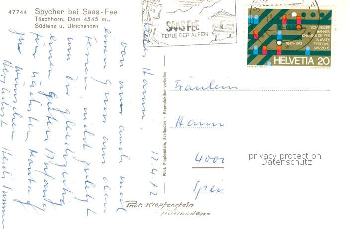 13821327 alte Postkarte Saas-Fee VS Spycher mit Taeschhorn Dom Suedlenz und Ulrichshorn postalisch gelaufen Erhaltung siehe scans [WerneD78] KatCode: 11470230750738