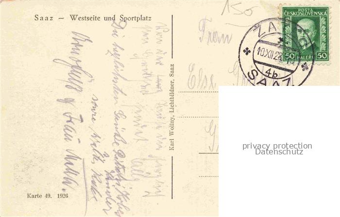 74059096 old postcard Saaz Zatec Aussig CZ Panorama Westseite und Sportplatz postalisch gelaufen Erhaltung siehe scans [FriedD77] KatCode: 11520