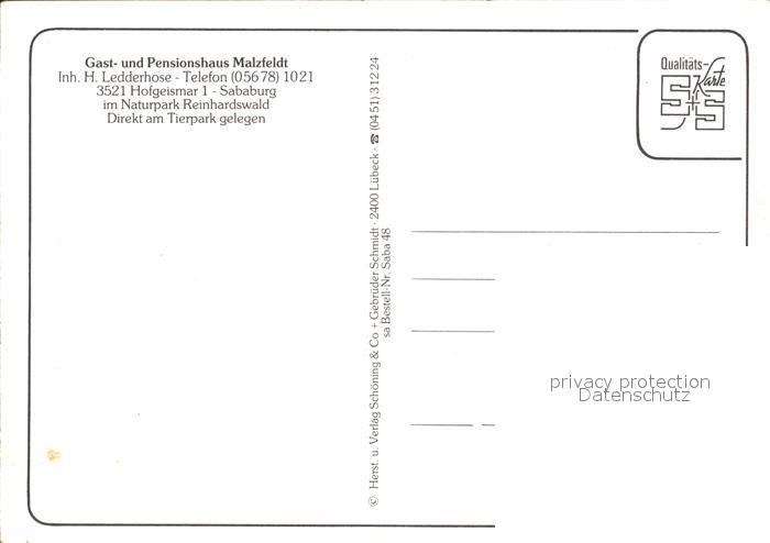 72425061 Sababurg Pension Malzfeldt Wild Hofgeismar postalisch nicht gelaufen Erhaltung siehe scans KatCode: 11110006633013