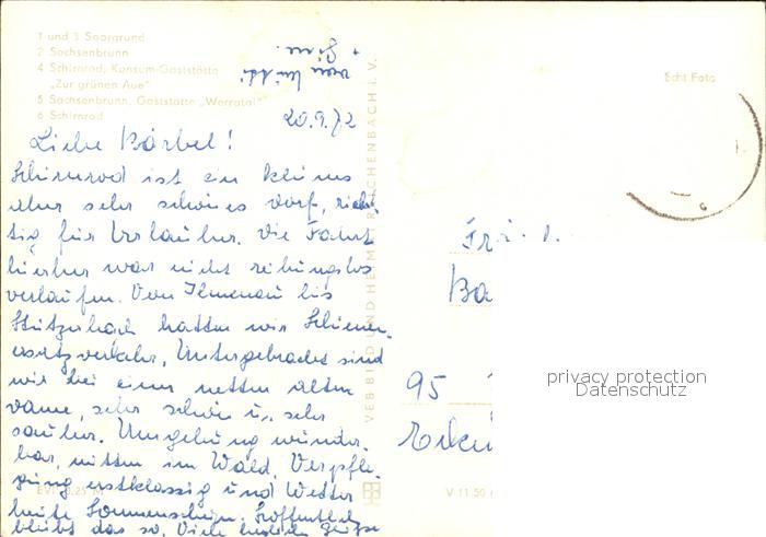 72477208 alte Postkarte Sachsenbrunn Schirnrod Konsum Gaststaette Zur gruenen Aue Gaststaette Werratal Schirnrod Saargrund postalisch gelaufen Erhaltung siehe scans KatCode: 11110016069039