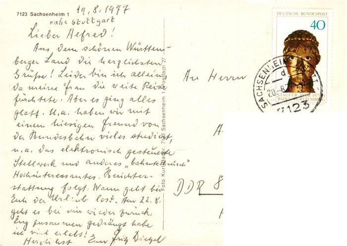 73945110 alte Postkarte Sachsenheim Fliegeraufnahme postalisch gelaufen Erhaltung siehe scans [FriedD77] KatCode: 11110008118076